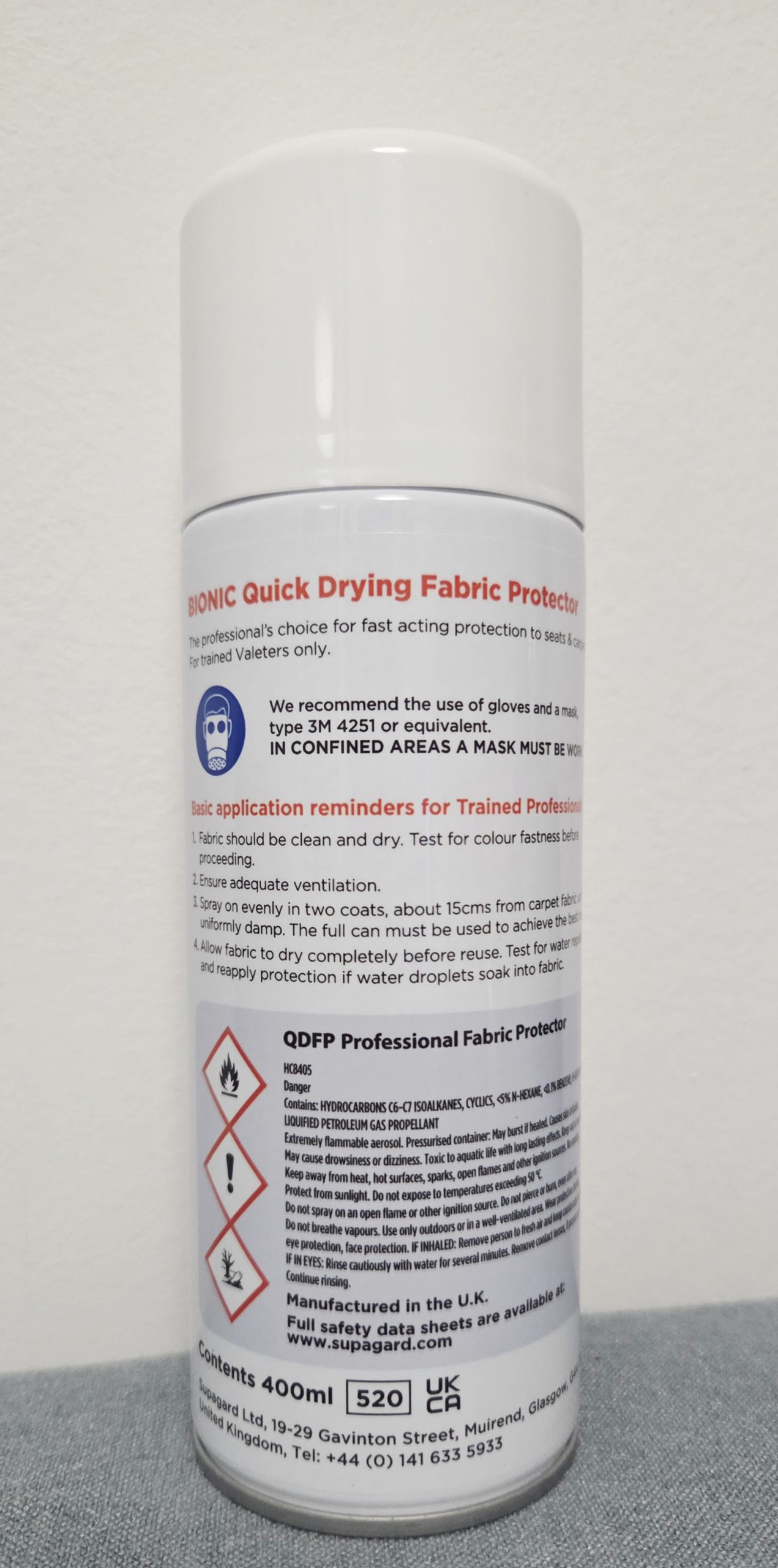 Supagard Interior gard će zaštiti sve tkanine u vašem automobilu. Veoma jednostavno za nanošenje, s 20 cm udaljenosti ravnomjerno naprskati na suhu i čistu površinu, te ostaviti da se osuši. Svojom posebnom formulom stvara nevidljivi sloj na zaštićenim dijelovima (sjedalima, tapetima, prtljažniku vozila). Sloj koji se stvorio neće propuštati tekućinu, prljavštinu, finu prašinu ni dlake od kućnih ljubimaca, te će zaštitit materijal od habanja i blijeđenja od sunca.