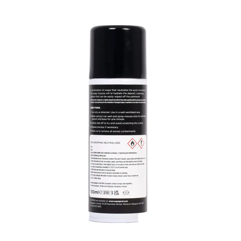 Posebna formula kombinira sapune i pH buffer koji neutralizira kiselinu u ptičjem izmetu. Pjena ponovno hidratizira osušene naslage i pretvara ih u topivu otopinu koju je moguće jednostavno obrisati bez oštećenja laka.