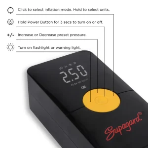 Kompaktan i praktičan prijenosni kompresor s dvostrukim napajanjem (baterija i priključak), 5 nastavaka, LED svjetlom i automatskim gašenjem. Idealno za gume, lopte, kajake i još mnogo toga!